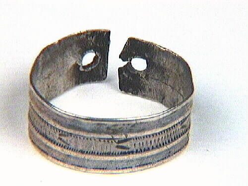 Öppen ring med hål i ändarna, något profilerad, mittbandet svagt cisselerat, pilformigt mönster.