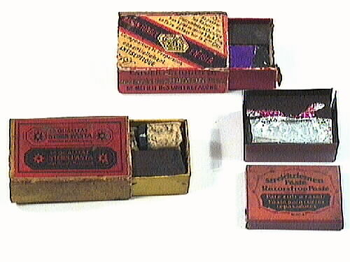 Pasta till strigel. 1,2: Askar, röda och gula. Papp. Längd: 51 mm, bredd: 34 mm, höjd: 18 mm.