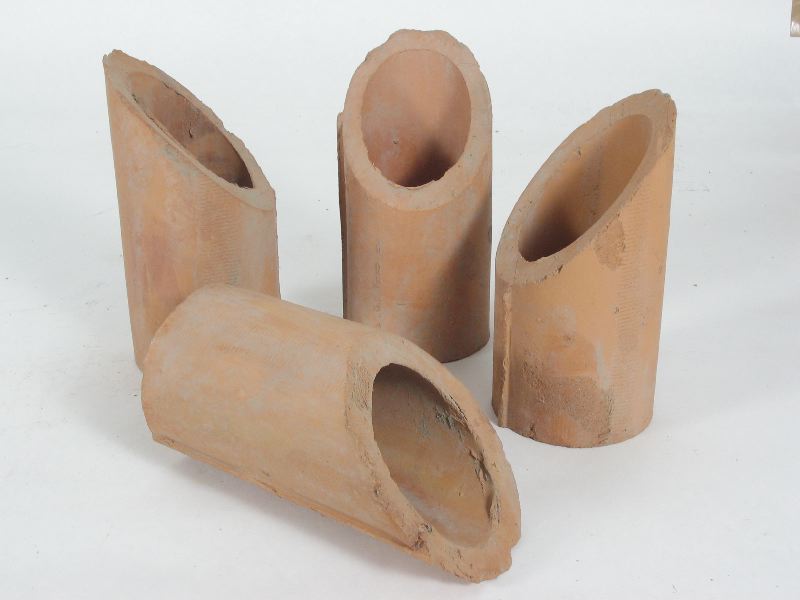 Fyra stycken rakta dräneringsrör avskurna i vinkel för att möjliggöra skarvning i 90 graders vinkel.