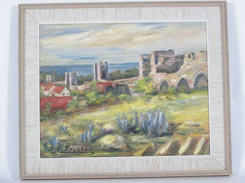 Signerad: "A. K. Ahlgren", på framsidan i nedre vänstra hörnet. På spännramens baksida står skrivet: "Ringmuren - Visby".