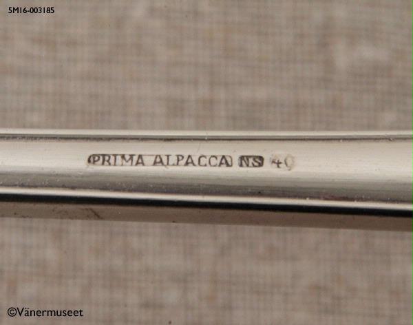 Soppslev av nysilver. Pressad i två delar, handtaget för sig och skopan för sig. Skaftet är senare fastlött på skopan. Skaftet smalnar av mot fästet, blir bredare uppåt och avslutas i en spets. Runt skaftets kanter finns en skåra. Stämpel på skaftet: "STADSHOTELLET, LIDKÖPING", i cirkel med Lidköpings vapen (S:t Nicolaus) i mitten. Stämpel på baksidan av skaftet: "PRIMA ALPACCA NS 40".