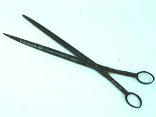 Troligen en handsmidd tapetsax. Långa skänklar med en avbruten spets. Strax ovanför öglan är en enkel profilering. Liten spik vid fästningen.