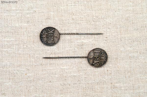 Klubbmärken, 2 stycken. Nålar att sätta i rockslaget med inskriptionen: LSK. Under inskriptionen finna en femuddig stjärna. Ovanför en bild av Justitia - rättvisans gudinna.