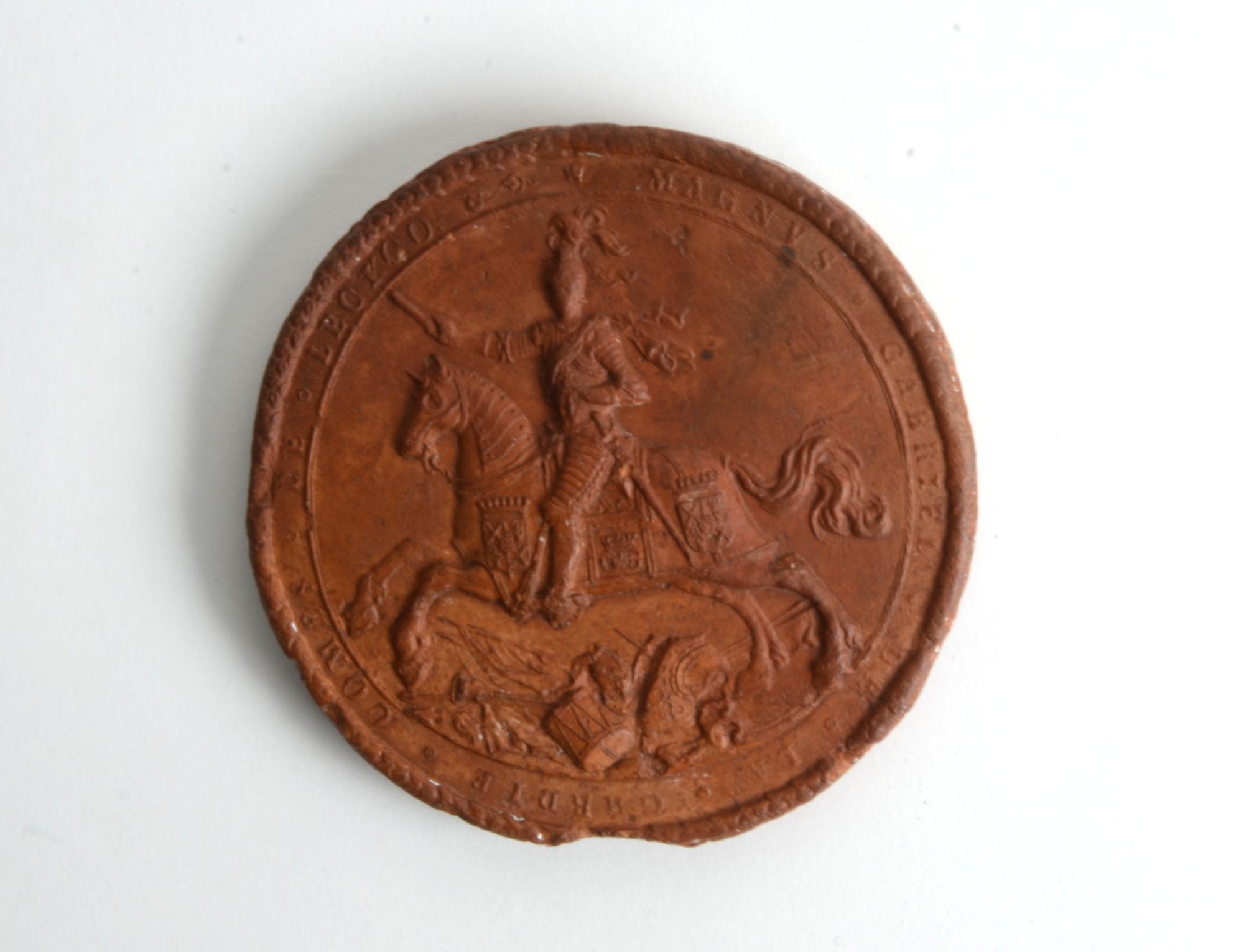 Omskrift på avtryck MAGNUS GABRIEL DE LA GARDIE COMES DE LECKOO. Avtrycket visar en ryttare i rustning till häst. På baksidan står Magnus Gabriel De La Gardies sigil 1845. Hänvisning till 5M16-7514.