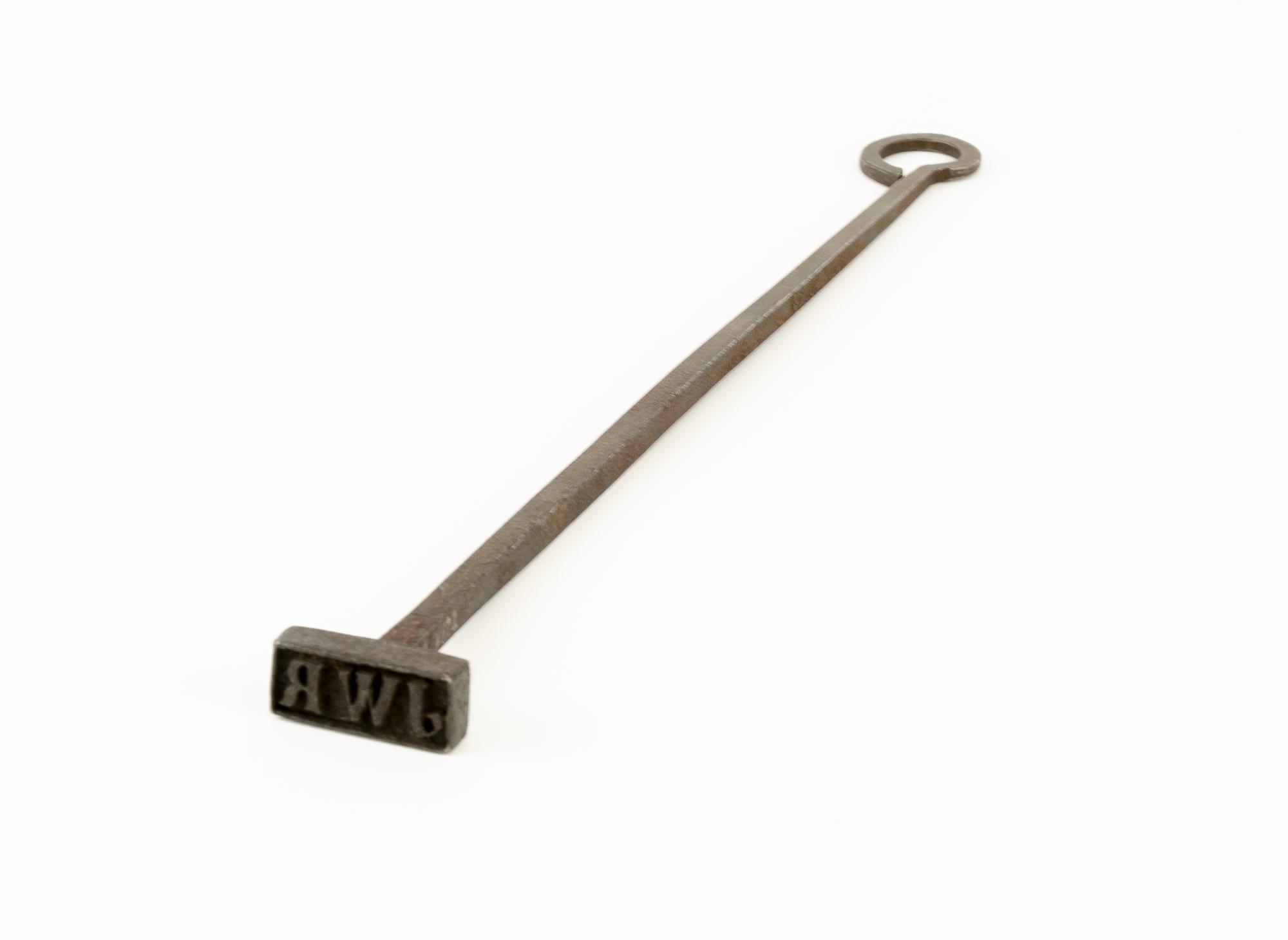 Stämpeljärn, firmastämpel. Rektangulär bottenplatta med följande bokstäver i relief: J W R. Skaft i fyrsidigt järn, avsmalnande upptill och avslutas med en enkel liten ögla.