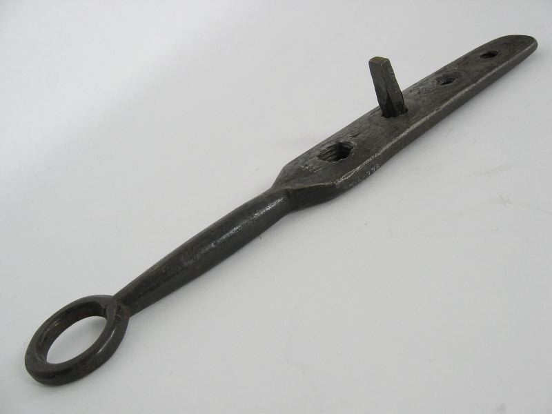 Gängdon med tapp. Oval gängskiva med fyra olika stora hål Cirkulärt skaft som avslutas i en ögla. En gängtapp. Skivan är för gängnigen av skruv och tappen är för gängning av muttern.