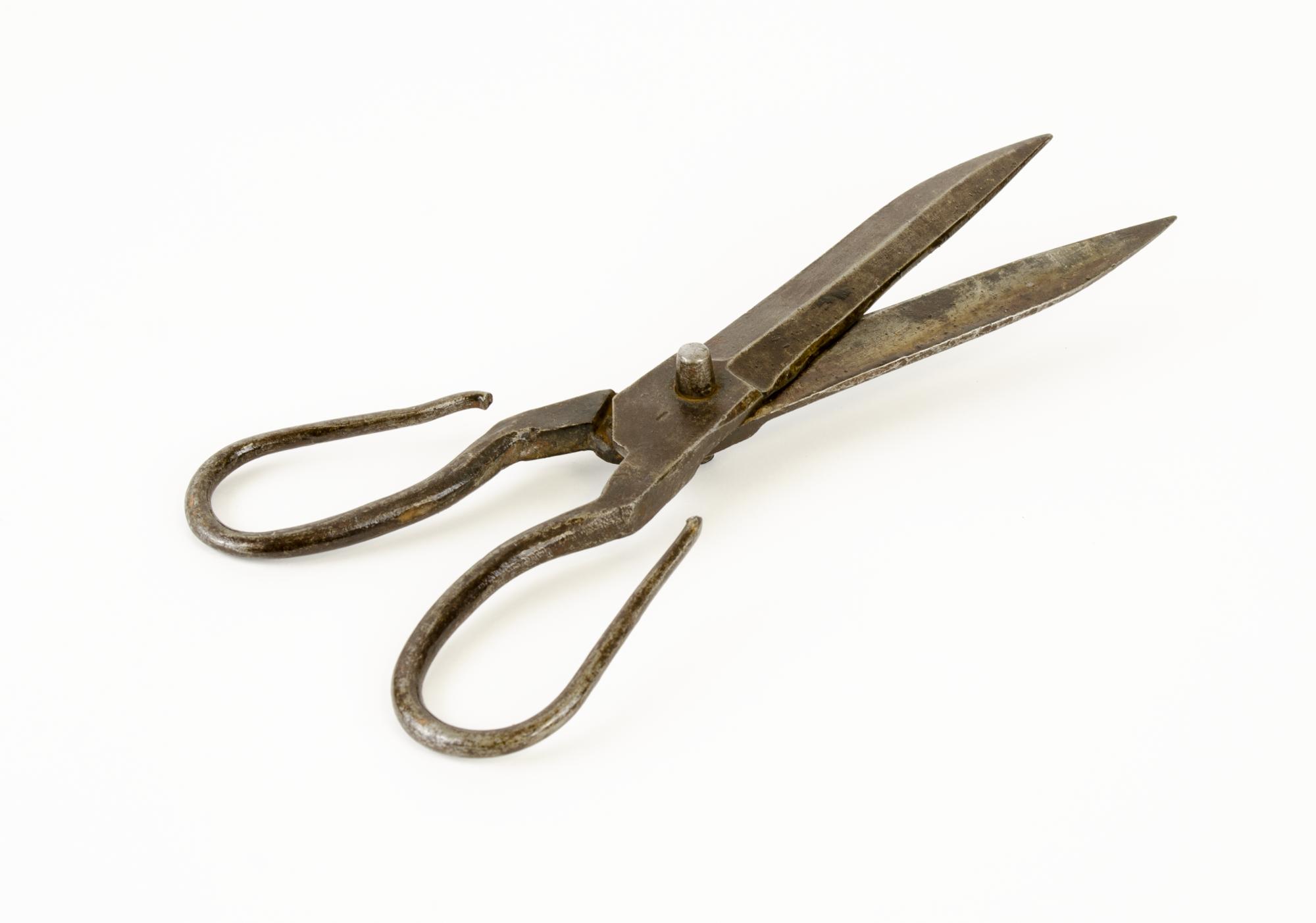 Sax, bokbinderitillverkning. Stor smidd sax med öppna öglor och lika stora skär. Under leden är instansat L......RG. ESKILSTUNA.