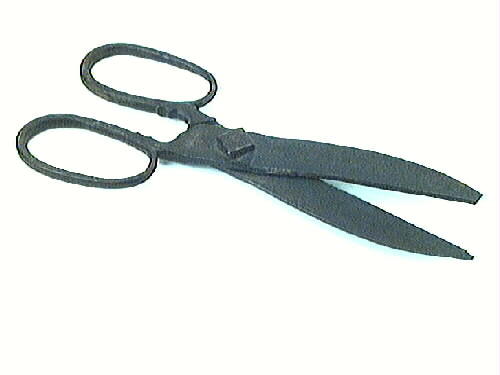 Sax, handsmidd skräddarsax, slutna öglor. Vid leddelens övergång i öglorna är båda sidorna dekorerade med vågkant. Leden består av en järnskruv med plant fyrkantigt huvud på ena sidan och fyrkantig mutter på den andra sidan. De lika långa skären är svagt halvmåneformade och den ena spetsen är avbruten.