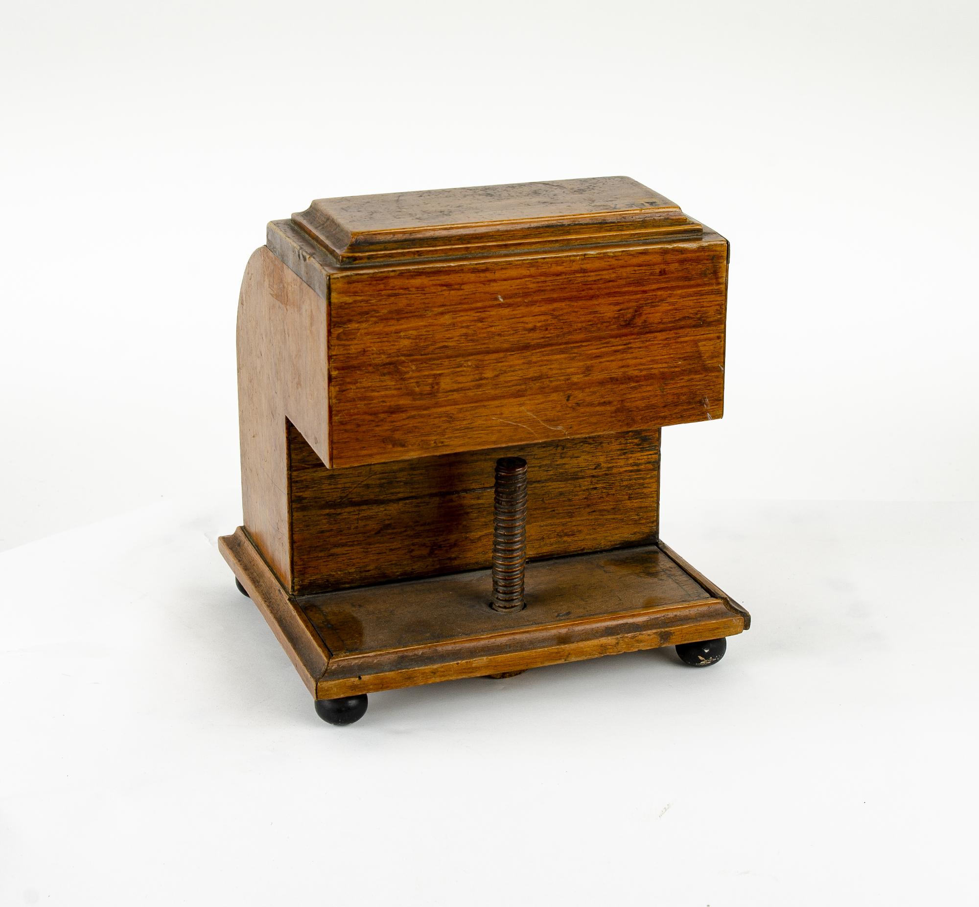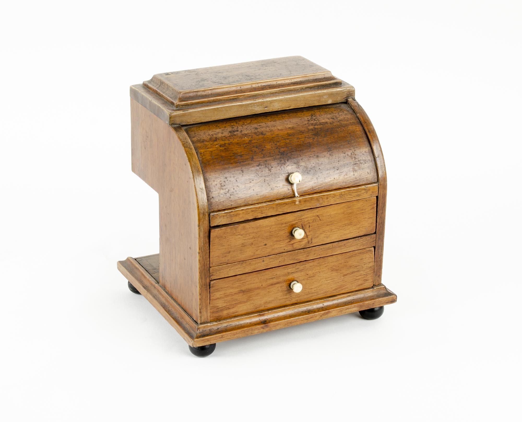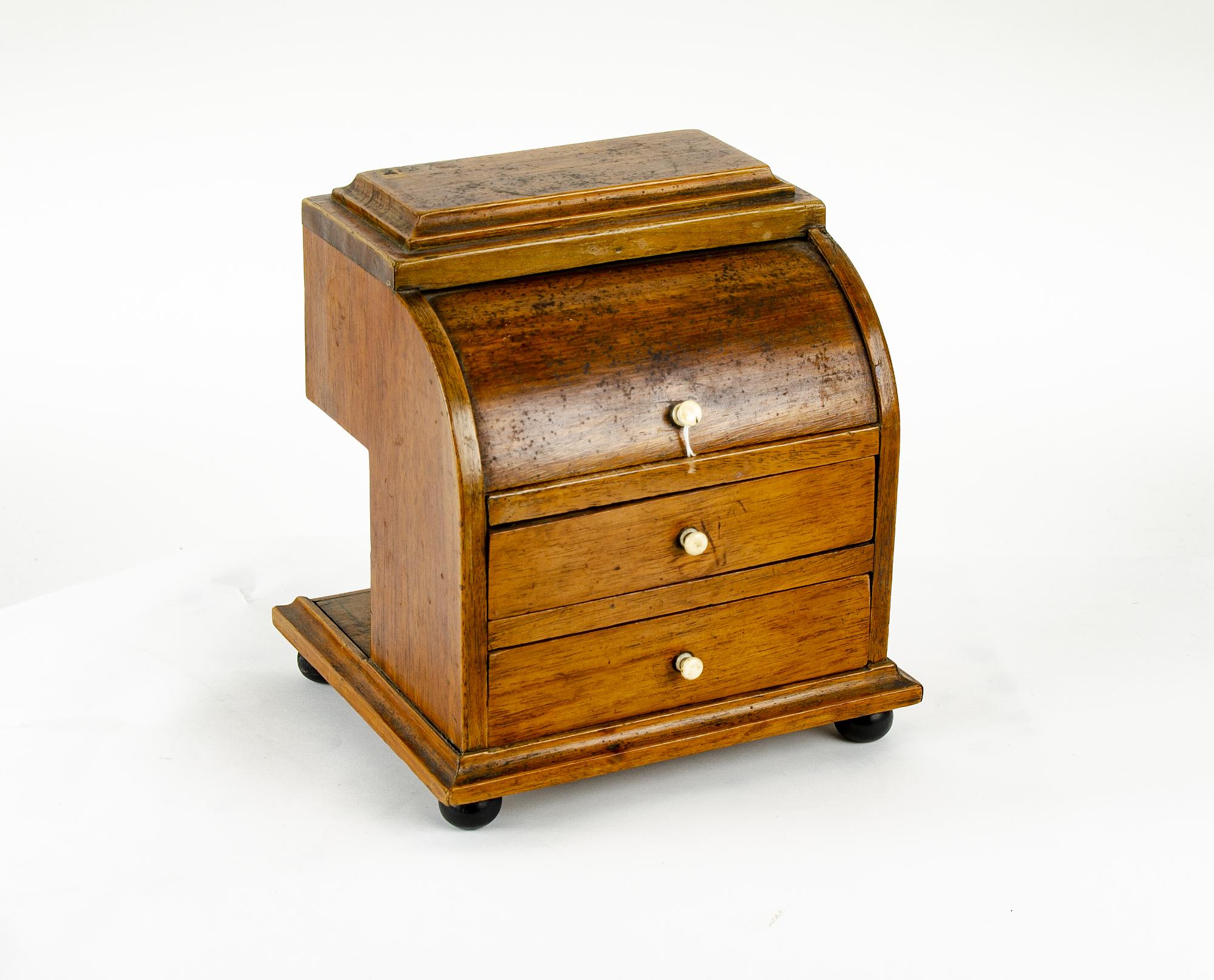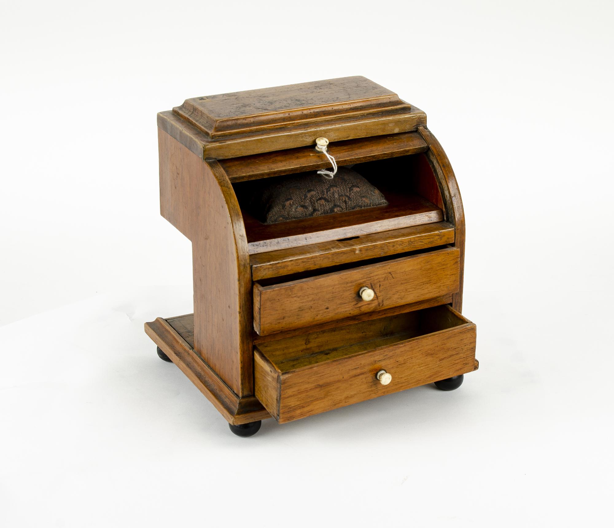 Sybyrå, skrädderi, liten med utskuren baksida för fäste i bordsskiva med en träskruv. Byrån har fyra kulfötter, profilerad kant nertill, två lådor och en rundad dragskiva. Innanför dragskivan finns en liten stoppad nåldyna i svart och brunt bommullstyg. Nåldynan sitter på en träskiva som kan dras ut då den är rörlig i en skåra. Plant överstycke med profilerad kant. Lådorna och den rundade skivan har vita små hornknappar till handtag. Givaren, skräddare Gustav Jakobson fick byrån från sin faster Britta Johansson f. Hansson, då han fyllde 50 år den 6 juni 1921. Vid katalogiseringen 1981 03 16 klistrades en kulfot fast med Karlssons klister.