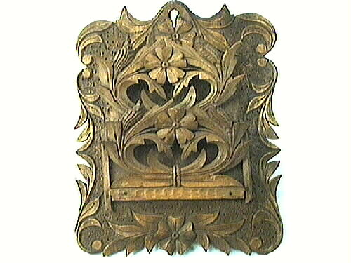 Pappershållare utskuren på en rektangulär träplatta. Kanterna är i bladrelief och innanför skuret till en läderliknande yta. På denna är två genombrutna bladreliefer snedställt fastspikade. Målad och betsad. Skrivet med blyerts på baksidan, kufs, ev.