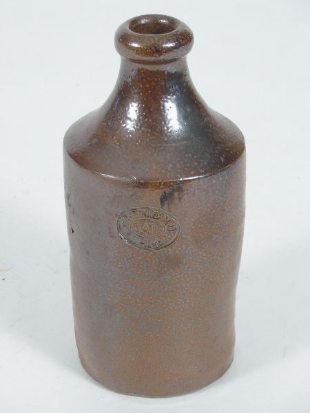 En glaserad lerflaska, från en förgyllarverkstad. På flaskan, som har brun glasyr, är inpressat JAD och HELSINGBORG.