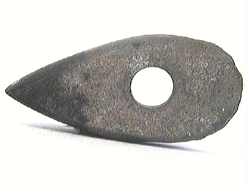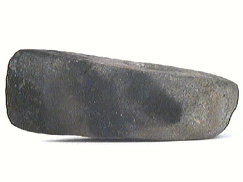 Skafthålsyxa. Tjockare mot eggen, rund men skadad nacke, välvd på ena bredsidan. Brandskadad.