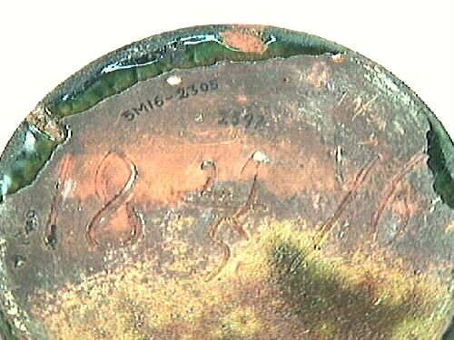 - Skål/ask, rak rund med grön glasyr. I övre kant plats för lock, vilket dock saknas.Runt kärlet ristade bårder och i mitten enkel slinga samt bokstäverna " K o k r a r k a " ev. I botten ristat 18 29/5 76. Tillverkad hos Schultz krukmakarverkstad Använd vid servering ev. Något kantstött.