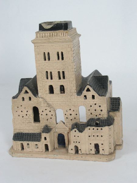 - Prydnadsföremål, föremål i form av fyrsidig borg med torn, av nationalromantisk karaktär. Tre sidor modellerade, slät baksida. Framsidan, skjulbyggnader på ömse sidor om ingång med pelare och tympanon, två våningar samt torn i tre våningar, färgat glas i fönstren. Ena gaveln med ingång och fönster, andra gaveln med fönster. Målad i ljusbrunt, taket i svart. Sprucken, färgen delvis avflagnad.