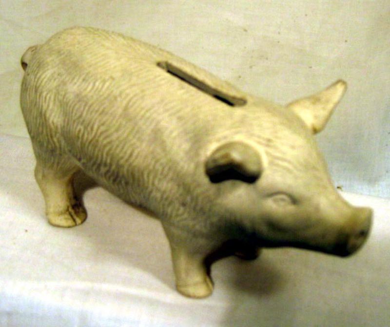 Sparbössa, leksak. Gris i gips. Mitt på ryggen en skåra för penninginkast.