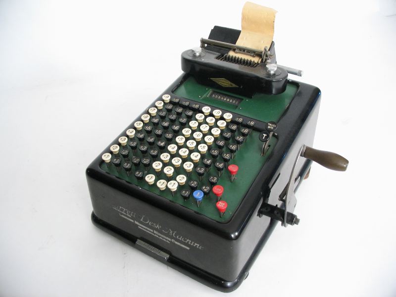 Räknemaskin, rektangulär, svartmålad på fyra gummifötter hållare för pappersremsa. Tio rader knappar på manöverbordet, vevarm i sidan. Stämplat: BARRETT DESK MACHINE , tillverkningsnummer: