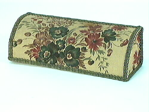 Lampskärm av tygklädd papp, bandkantad, i form av böjt rektangulärt stycke med sidostycken som trianglar. Inuti glödlampshållare i gulmetall och porslin.