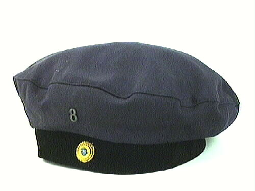 Skolmössa från Lidköpings Flickskola. Blått tyg med svart sammetsband runt. På bandet ett blågult märke. Ovanför ett klassmärke i vitmetall, mörknad 8.