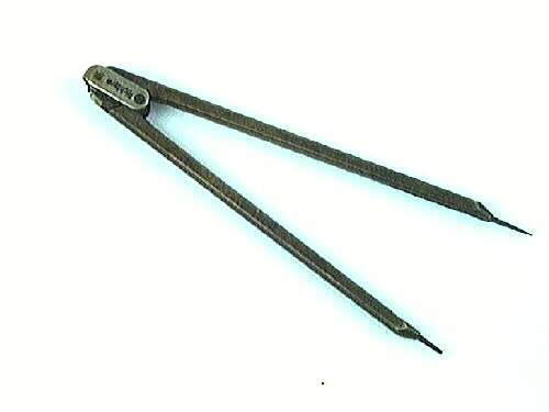 En passare med de två mässingskänklarna fästa i en metallbygel. I skänklarnas spets sitter en stålspets resp. ett ritstift.
