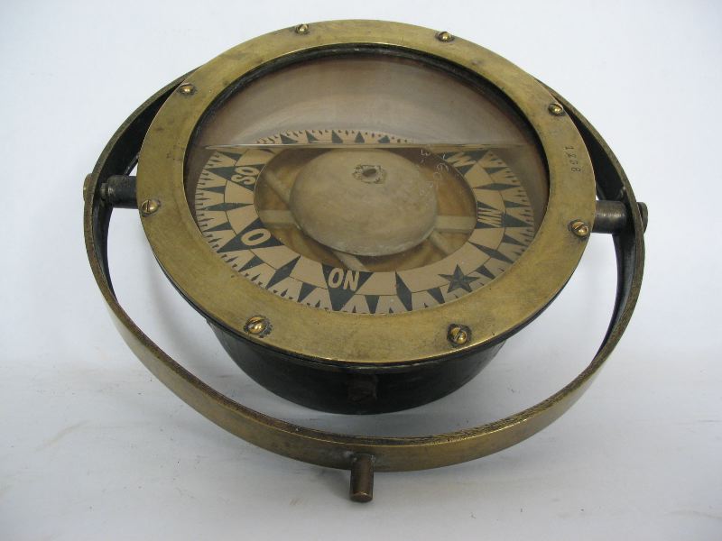 Vätskekopmass för kardansk upphängning. Cirkulär kompasskål i metall, svartmålade sidor och omålad botten, insidan vitmålad. Skålens ovansida är glasförsedd och glaset är fäst med ett brett mässingsband, fäst med åtta skruvar, och med tillverkningsnummret: 1238. På glaset är ristat certifikatnummer: 3606 PK, 23-10-18. Den yttre ringen för upphängning, består av ett mässingsband. Skålens inre är fylld med vätska, troligen alkohol blandat med vatten, kompassen består av en 25 mm bred ring fäst på de parallella magnetstavarna som är förbundna med den centrala flottören. Vätskan och flottören har som uppgift att minska och balansera påverkan från rörelserna. Kompassrosen har väderstrecken utmärkta enl följande: NO, O, SO, S, SW, W, NW och femuddig stjärna som norr-streck.