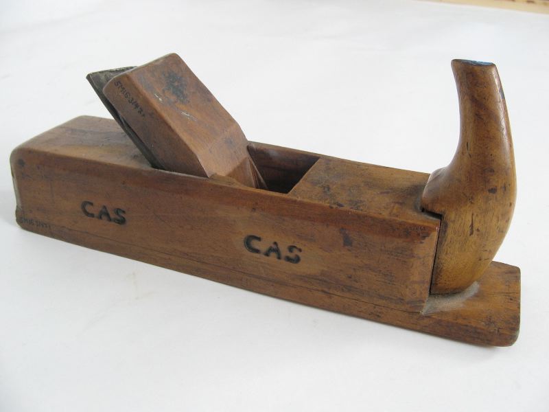 På varje långsida är initialerna CAS inbrända två gånger. Kilöppningens långsidor är böjda, kilens ovansida är svagt välvd och initialerna CAS är inbrända. Hyveln har dubbla järn, sammanhållna med en skruv. På ena järnets ovansida står tillverkarstämpeln: VARD.