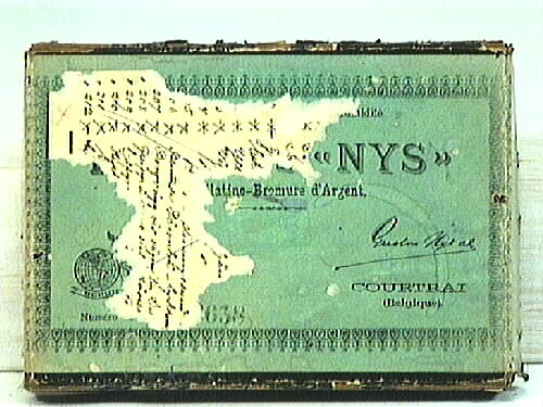 Ett trasigt papper, med anteckningar är klistrat ovanpå firmamärket. En svart pappersremsa är klistrad längs kartongens sidor.