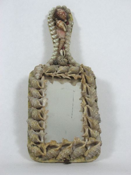 - Handspegel med rektangulärt glas. Rektangulär ram, droppformat handtag, 110 mm långt. Ram och handtag är dekorerade med olika snäckor. Baksidan klädd med spräckligt, rutigt papper i gult, grönt och orange. Sjömansminne.