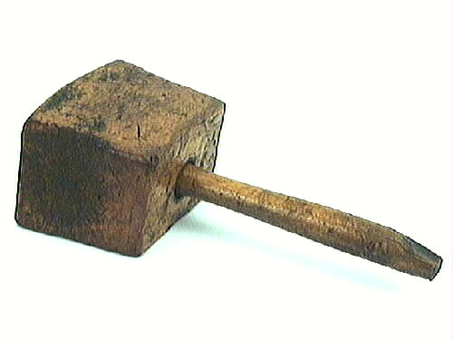 Träklubba, använd av skeppsbyggare. Kort runt svarvat trähandtag, tappat genom klubban. Själva klubban är rektangulär med slagyta på de fyra sidorna som är parallella med handtaget. Märken i klubban efter järn mm. Handtaget är något skadat i änden.