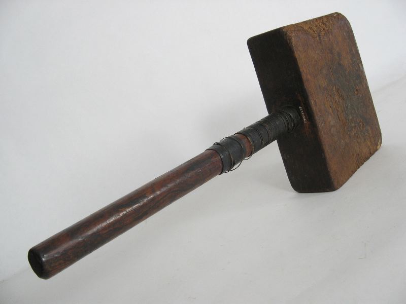 Träklubba, använd vid skeppsbyggeri, för att slå in såväl trä- som järndetaljer. Träklubban har runt svarvat handtag som nedtill är klätt med tjärat snöre, detta för att man skall få bättre grepp vid arbetets utförande. Handtaget är tappat i klubban. Själva klubban utgörs av en stor rektangulär träbit som har slagytor på de sidor som är parallella med handtaget. Märken efter slag, mycket sliten klubba. Rester av tjära på hela klubban.
