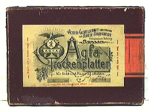 En kartong med lock i papp, klädd med mörkrött papper. Påklistrade etiketter, med instruktioner och firmamärke, tex på engelska, tyska och franska.
