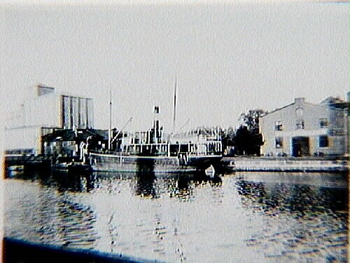 Baksidetext av fotogrfen: "Guppas båt (Ahlberg= Guppa) EOS, ångfartyg i Lidköpings hamn strax innan den skulle upphuggas i Sjötorp. Åsåg bogseringen dit från Giacominas fönster."