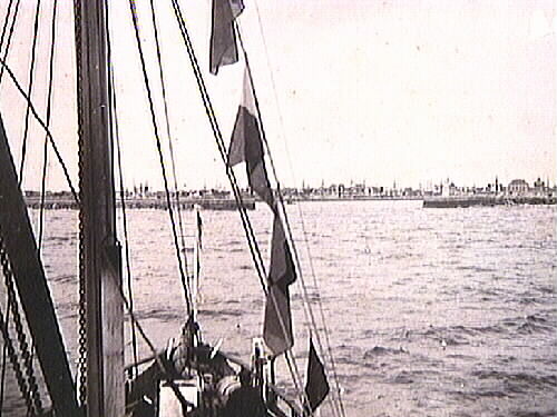 Fotot är taget från ett ångfartyg, brygga mot fören, under ingång till Skagens hamn.