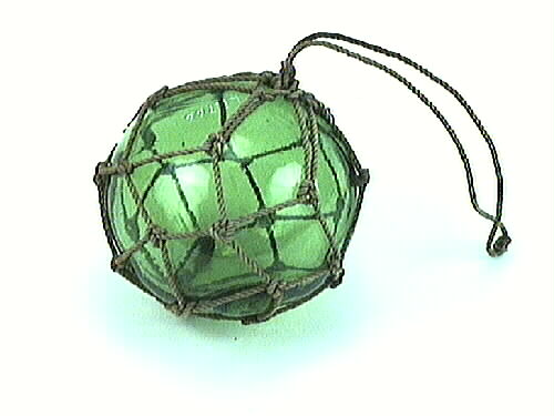 Ett flöte av grönt handblåst glas. Flötet är klot-