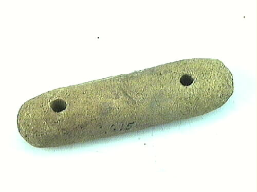 Ett cylindriskt sänke i gråtegel, med rundade kortändar. Ett genomgående hål i varje kortsida, för fäste av garn.