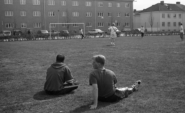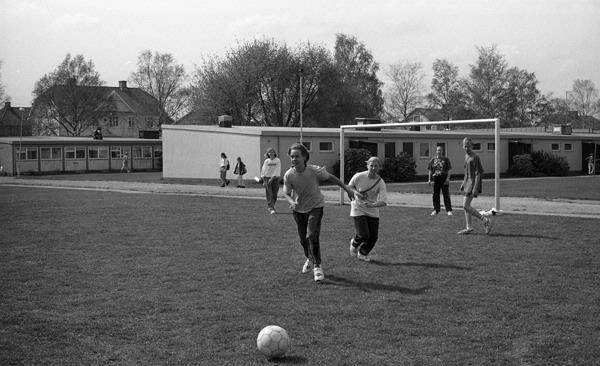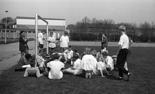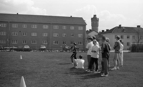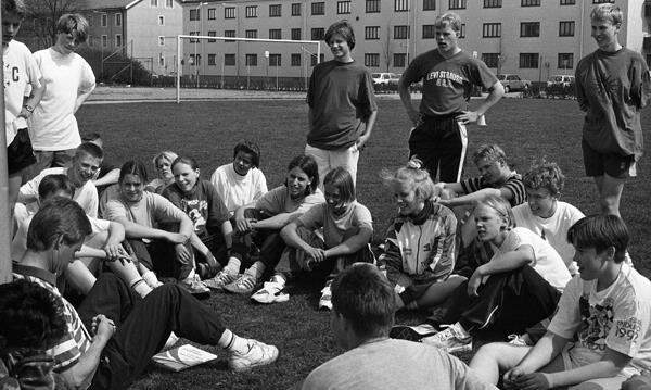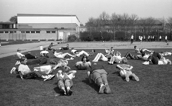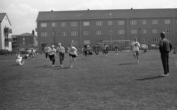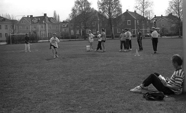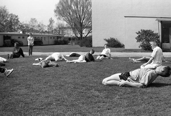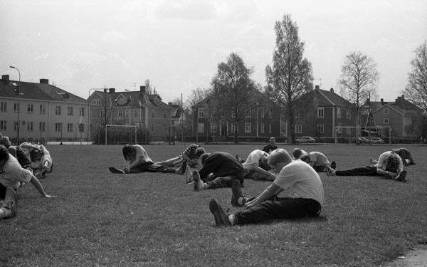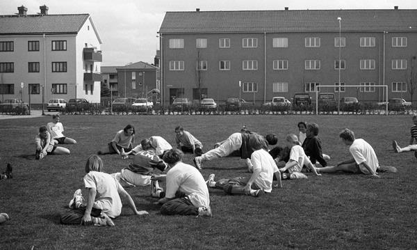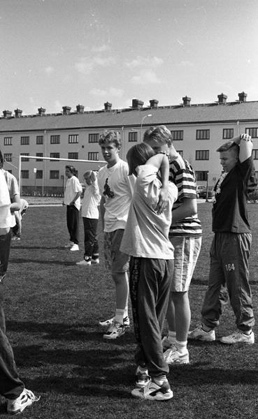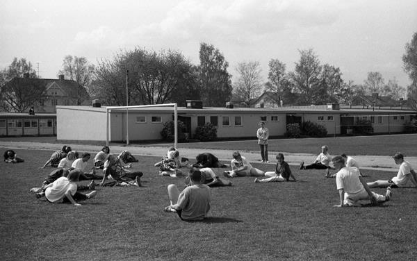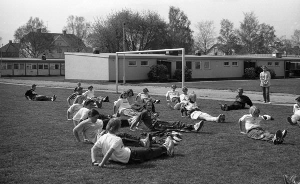 3. Föräldradag i Rudensköldsskolan: klass 9A. Gymnastik, uppvärmning. Gymnastikmagister Tomas Dalemo övervakar.