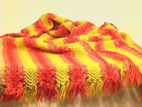 Virkad schal eller filt gjord av längder i grönt som virkats samman med uddmönster i rosa och rött. Frans i kortsidorna i samma garn som schalen.