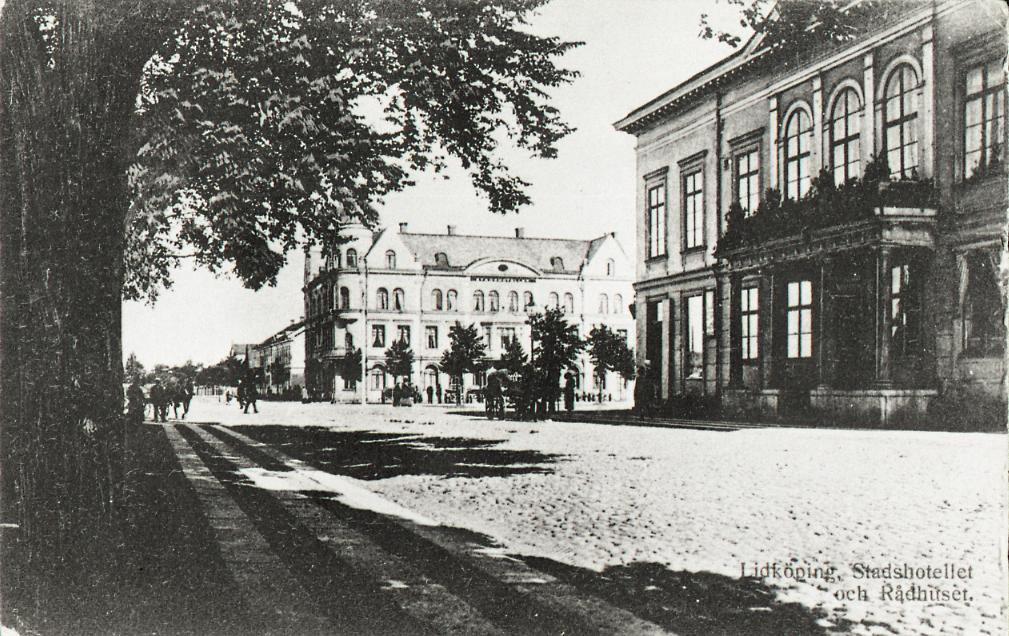 Lidköping, Gamla Staden. Hamngatan, Lidbeckska huset (f.d. nya Rådhuset) till höger och i fonden Stadshotellet med Gamla Stadens torg framför.
