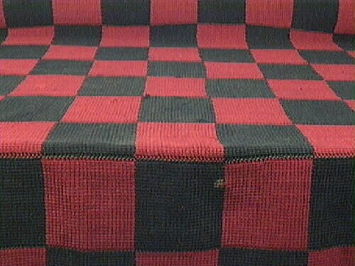 Krokade längder i omväxlande svarta och röda hopvirkade fält. Färdig är schalen rutig.