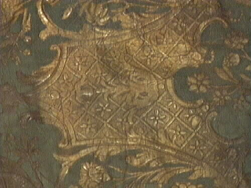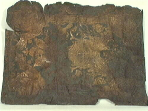 Troligen stolklädsel av gyllenläder, enligt äldre etikett, sannolikt beklädnad till en karmstol. Ett rektangulärt stycke med förgyllt mönster av växter och fåglar i lätt relief på mörk gröngrå botten.