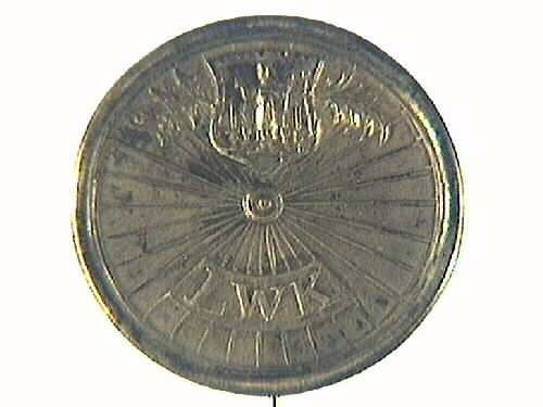 Ett runt föreningsmärke i form av ett cykelhjul, med präglade ekrar. På dessa sitter överst en sköld, med Lidköpingsvapnet S:t Nicolai. Under står LWK (Lidköping Velocipedklubb).
