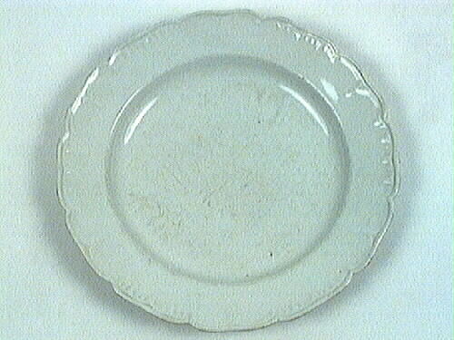 En mattallrik av vit fältspaltsporslin. Det är små inskärningar i randen.