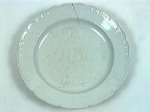 En mattallrik av vitt fältspatsporslin. Det är små inskärningar i randen. På brämet, vid randen är en vit reliefdekor av istappar och växtmotiv.