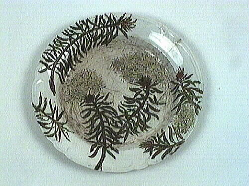 En väggtallrik i vitt. På spegeln och brämet är en målning i olja (?), föreställande klippörtliknande plantor med femtaliga, vita blommor i täta flockar.