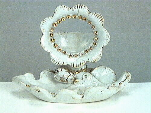 Ett fickurställ av vitt, saltglaserat lergods i form av ett eklövsformat fat, med oval botten. På fatet är en blomma med 9 stycken stiliserade kronblad. Halva blombotten ger plats till fickuret.