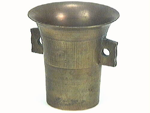 En mortel av mässing. Cylinderformad med vidare, utåtböjd rand. Två rektangulära handtag, med ett runt hål i. De är något profilerade vid utsidan. Sparsamt dekorerad med ringar runt morteln.