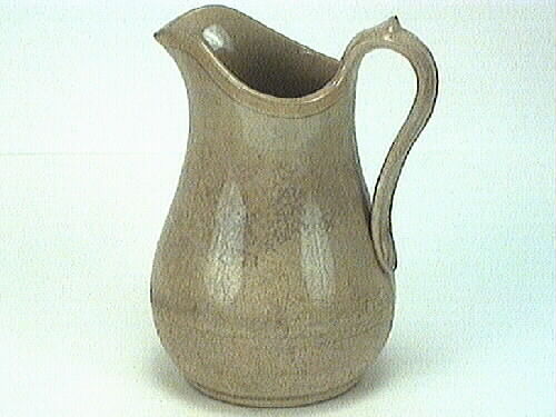 En kanna med handtag av grå-beige glaserat flintporslin. Randen är gul-beige.