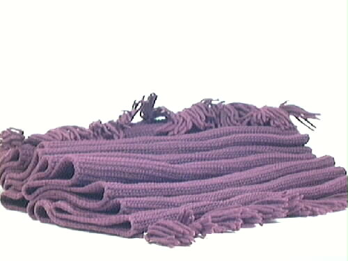 Långschal, virkad i yllegarn, kort knuten frans i båda ändarna co 70 mm lång. Många knutar på baksidan, vinröd färg. Några malskador.