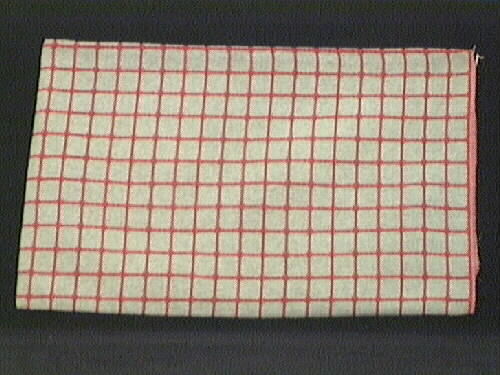 Kuddfodral till prydnadskudde. Sytt av ett rutigt maskinvävt tyg i rött och grått. Delvis öppen i den ena kortsidan för istoppning av kudde.