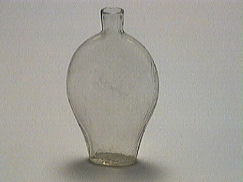 Fickflaska av ofärgat glas, med oval botten och platta långsidor. Flaskan har en kort, konisk hals och flaskan smalnar starkt av mot botten.