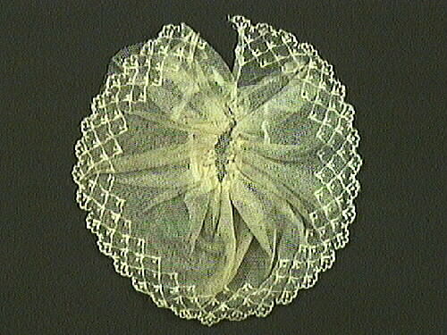 Hätta. Ett stycke, dubbel, vit, tyll är rynkad och fastsydd på ett litet rektangulärt stycke tyll. Det övre tyllagret är broderat med vit tråd i kanten.